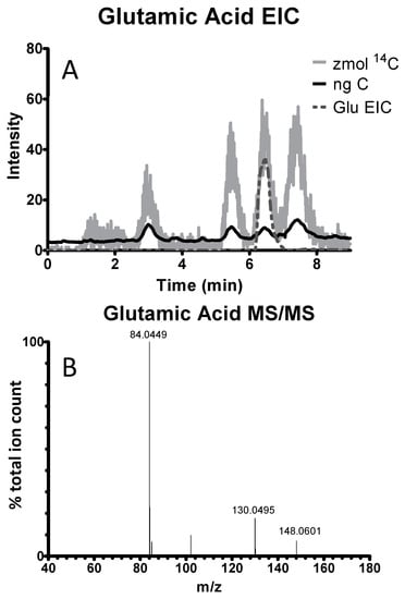 PAMMS provides accurate mass measurement and tandem mass spectrometry for structural elucidation of individual analytes separated by HPLC, but also measures stable carbon and carbon-14 in each separated analyte. PAMMS can therefore enable definitive identification, as well as quantitation, of each separated analyte. For example, Figure 3 shows separation of glutamic acid in a mixture of 14C-labeled amino acids, and identification based on the exact mass and MS/MS fragmentation pattern.