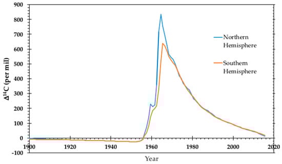 Above-ground testing of nuclear weapons produced an anthropogenic spike in atmospheric 14CO2 and consequently produced a small, but measurable excess 14C label in every living thing on the planet. This spike in 14C is generally called the radiocarbon bomb pulse. The pulse nearly doubled the natural atmospheric 14C between 1955 and 1963, when the Limited Test Ban Treaty ended atmospheric, under water, and outer space detonations by the United States, Soviet Union, and the United Kingdom. Since the peak in 1963, atmospheric 14CO2 has been decreasing as carbon moves into the biosphere and marine reservoirs and the burning of 14C-free fossil fuels drives the atmosphere to pre-bomb 14C in 2018 to 2019. The date of biological molecule synthesis is highly correlated to atmospheric 14CO2, so the atmospheric record is a chronometer of the molecular age or carbon source. Figure 4 depicts the ratio of atmospheric radiocarbon to total carbon (14C/C) from 1900 to 2015 for the northern and southern hemispheres based on compiled data []. The 14C/C differs between the hemispheres since the weapons tests were conducted at relatively few locations, mostly in the northern hemisphere. Before 1955 and after 1970, there is little difference in the annual averages of the hemispheres.