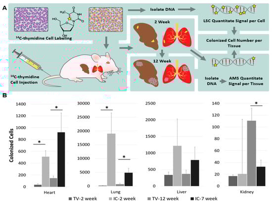 Using a similar principle, we can also quantify the number of cancer cells that colonize distant sites to form metastatic tumors []. In a recent publication, we have taken cancer cell lines with varying metastatic potential, and labeled them in vitro with 14C-thymidine, such that we could identify by AMS a single labeled cell among 1 million unlabeled cells. These labeled cells were introduced in mice via various routes known to produce metastatic tumors (tail vein, TV; intracardiac, IC) and after 2-weeks or 12-weeks post injection, all organs were examined for the presence of metastatic tumors. Whether visible tumors were present or not, total DNA was isolated from each organ, and the total carbon was examined for the presence of 14C. The amounts of 14C detected per organ were referred back to the amount of 14C present per cell, prior to injection into the mice, to determine how many cells traveled to distant sites and initiated a metastatic tumor (Figure 5A).