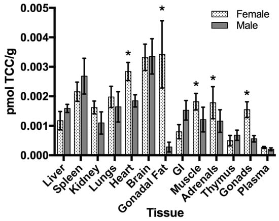 Tissue distribution of 14C-TCC in exposed offspring at postnatal day 42. Data is expressed as pmol of TCC/gram of tissue ± SEM (n = 5/sex). * p < 0.05, when comparing female to male offspring.
