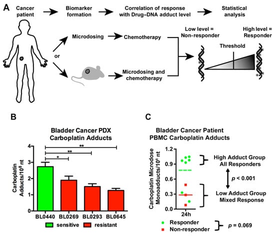 Figure 8 shows data supporting the correlation between drug-DNA adduct levels and in vivo treatment response in mice and humans. Mice bearing patient derived bladder tumor xenografts (PDX) were established as depicted in Figure 8A. There was a significant correlation between microdose-induced carboplatin-DNA monoadduct levels and tumor growth inhibition of platinum-based chemotherapy (Figure 8B). The pilot clinical trial accrued 10 bladder cancer patients (stage II and higher), for whom platinum-based chemotherapy was administered. Patients were administered approximately 1% of the therapeutic dose of [14C]carboplatin (a microdose), followed by blood sampling within 24 h. DNA isolated from peripheral blood mononuclear cells (PBMC) was assessed for carboplatin-DNA adduct levels by AMS. Within three months of the microdosing assay, patients began standard of care chemotherapy regimens consisting of either cisplatin or carboplatin in combination with other drugs (typically gemcitabine (GC) or methotrexate, vinblastine, and doxorubicin (MVAC)). Patient response was determined at the time of cystectomy—typically after three cycles of chemotherapy. A patient whose tumor burden in the bladder was reduced to pT1 or less was considered a responder and a patient with a pT2 or greater tumor was considered a non-responder, based on standard RECIST criteria []. The main endpoint of the study was to demonstrate a significant difference in the mean drug-DNA adduct levels in PBMC (a surrogate for tumor tissue) between responders and non-responders. Seven patients responded to chemotherapy (green circles), whereas three patients showed disease progression (red squares) (Figure 8C). Responders exhibited approximately 2-fold higher mean monoadduct levels (green line) than non-responders (red line) (0.741 ± 0.346 vs. 0.283 ± 0.202 monoadducts/108 nt, respectively, p = 0.069). The drug-DNA adducts were distributed in two distinct groups; high (0.941 ± 0.030 adducts per 108 nt) and low (0.266 ± 0.158 adducts per 108 nt) drug-DNA adduct levels with a statistically significant difference (p < 0.001). All five patients in the high adduct level group responded to chemotherapy, which is a 100% positive predictive value (PPV) for this group. The low adduct level group included three non-responders and two responders. The results of this clinical trial show a clear trend for responders to have higher Pt-DNA adduct levels 24 h after microdose administration, which supports the feasibility of patient stratification by the diagnostic microdosing approach.