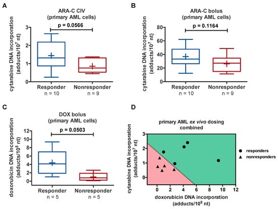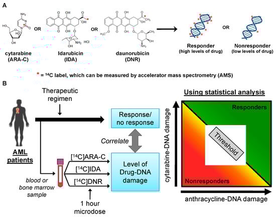 Basic research into the significance of drug–DNA adducts in patients treated with anthracycline derivatives and antimetabolites similar to IDA [] and ARA-C [] chemotherapies has been reported, but none of these findings have been translated into clinical use [,,,,,]. Several reports have documented associations between drug–DNA adduct levels and clinical response and overall survival [,]. These reports support the concept that a predictive stratification strategy can be used to personalize chemotherapy if the capacity for cells to form high levels of drug-DNA adducts can be predicted prior to the initiation of therapy. This body of work is being adapted to predicting AML patient responses to 7 + 3 induction chemotherapy by implementing a diagnostic microdosing test (Figure 9B).
