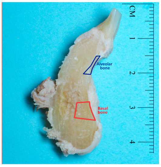 Mandibles were processed in our laboratory. Soft tissue was removed from the teeth and bone with periodontal instruments. Samples of alveolar bone (blue outline in Figure 1) and basal bone (red outline in Figure 1) were further dissected to be tested separately for Cd content.