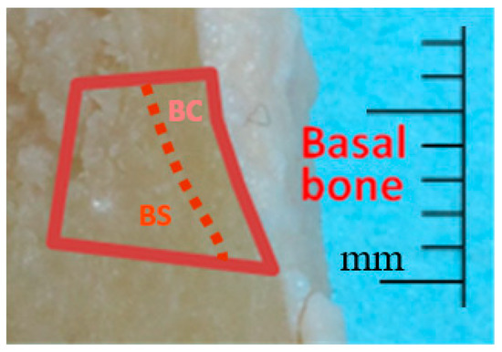Image showing a representative human mandible jaw section after gross dissection where basal cortical bone samples (BC) and basal spongy bone samples (BS) were harvested to be analyzed for Cd content.