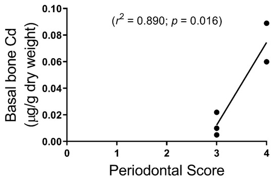 Potential significant differences in Cd content between alveolar and basal bone were determined using a paired t-test while correlations between Cd content of various tissues or periodontal scores were performed using Pearson’s correlation analysis with the Graph Pad Prism (v. 7.04) statistical program (La Jolla, CA, USA). For all analyses, p ≤ 0.05 was considered statistically significant. All data are expressed as mean ± standard error.