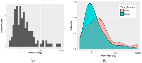 Distribution of the measured pad exposure: (a) Histogram of exposure levels measured in individual pads; (b) Probability density function of the measured exposures depending on the tractor type.