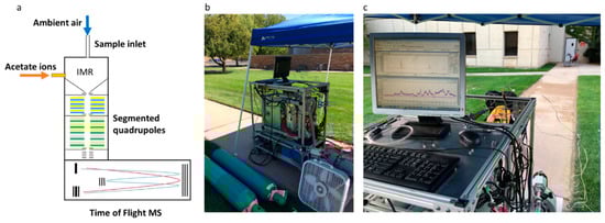The acetate-CIMS (Tofwerk AG, Thun, Switzerland and Aerodyne Research, Inc., Billerica, MA, USA) is described in detail elsewhere [,]. The acetate-CIMS is a real-time mass spectrometer designed for atmospheric chemistry measurements. Our instrument, in particular, is racked to ensure it is portable (300 kg; 0.6 m × 1.1 m × 1.3 m; on wheels; power requirements < 2 kW), enabling field measurements [,,,]. The acetate-CIMS consists of a short inlet (<5 cm of stainless steel) that samples ambient air into an ion-molecule reaction chamber. Ambient air is mixed with acetate reagent ions at decreased atmospheric pressure (typically 80–100 mbar), before progressing through a series of segmented quadrupoles as the pressure is reduced before the time-of-flight detector.