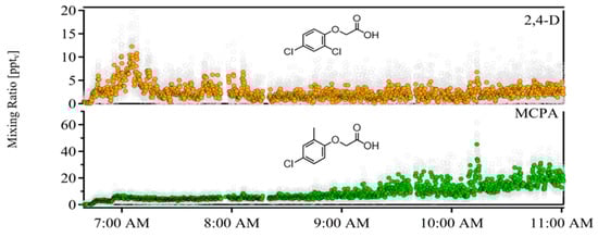 Herbicide application caused clear increases in both 2,4-D and MCPA mixing ratios above background ( Figure 2 and Figure 3). No herbicide-related peaks were observed before application. Once spraying commenced, peaks associated with 2,4-D were immediately apparent, reaching a maximum of 13 pptv during the closest pass of the spray boom, with an average of 4 ± 3 pptv (1σ) during the application period. MCPA mixing ratios were also enhanced above background during the application period (average 4 pptv), but reached their maxima several hours after application (70 pptv at 10:15 am). Neither fluroxypyr nor triclopyr was observed in the field; the acetate-CIMS instrument is capable of detecting these herbicides in lab settings, but these compounds were an order of magnitude lower in concentration than MCPA in the applied solution, suggesting that the concentrations were below the instrument’s detection limit.