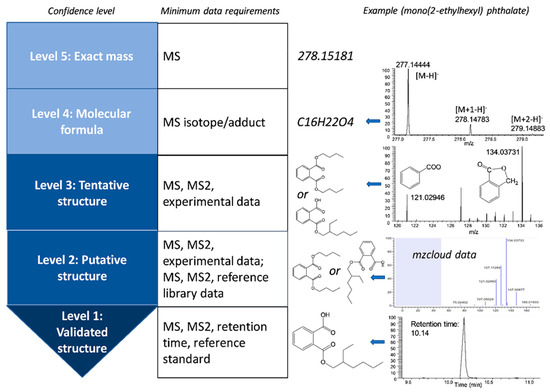 Proposed confidence levels in unknown xenobiotic identification with high resolution mass spectrometric analysis and exemplified with mono(2-ethylhexyl) phthalate.