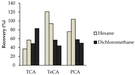 Figure 1. Better results were achieved with hexane for TeCA and PCA. However, recoveries for TCA were similar for both solvents. Taking into account these results, both hexane and dichloromethane were used in the evaluation of the matrix effect.