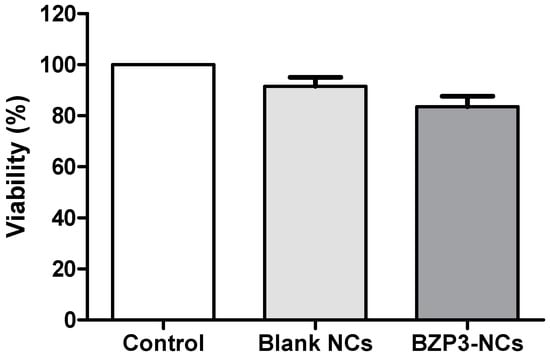 Using the MTT assay, our non-loaded (blank) and BZP3-loaded NCs did not exhibit metabolic changes in the cell culture, nor cell death (Figure 1). Cell viability above 70 wt% were recorded (91.12 wt% for non-loaded and 89.45 wt% for BZP3-loaded NCs), which demonstrated the NCs to be non-cytotoxic [,,]. No statistical difference was observed using the ANOVA test. The MTT reduction assay is widely used and was the first developed cell viability assay. Viable cells with active metabolism convert MTT reagent into a purple-stained product, while dead cells are not capable of such reaction. The mechanism behind it involves reactions with reducing molecules such as NADH that transfer electrons to MTT. The released purple-colored compound is an insoluble intracellular precipitate that accumulates near the cell wall. In this work, we did not observe any difference among samples; however, the sample may accumulate in the wall or the cell with the MTT. No cytotoxicity was observed in this assay, but more details may be obtained with complementary in vitro cell techniques.