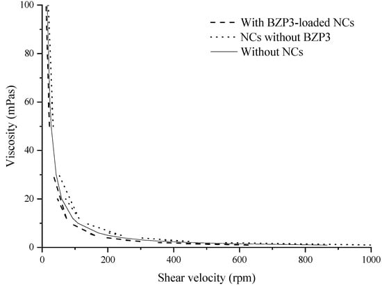 Variation of the viscosity as a function of shear rate of blank semi-solid formulation (without NCs), semi-solid formulation with blank NCs (NCs without BZP3) and semi-solid sunscreen (with BZP3-loaded NCs).