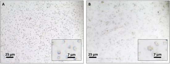 Both the semi-solid formulations, containing blank NCs (without benzophenone-3) in Figure 5A and containing the benzophenone-3-loaded NCs (BZP3-NCs) in Figure 5B were analyzed by optical microscopy to confirm that NCs remained individualized within the semi-solid network (Figure 5). Uniformily distributed spherical shaped nanocapsules of approximately 3 µm were clearly visible in both the cases.