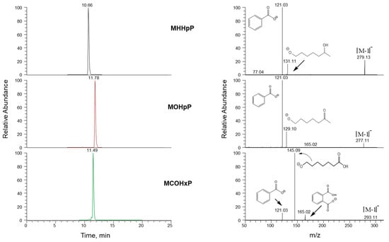 We obtained the mass spectra for all three metabolites using analytical standards prepared in acetonitrile and optimized the fragmentation of the precursor ion for each metabolite (Table 1). We adapted published analytical methods for measuring phthalate oxidative metabolites in urine [,]. Briefly, urine (0.1 mL) and calibration standards (0.013–130 ng/mL) were spiked with an internal standard solution (5–10 ng/mL) containing d4-MHHpP, d4-MOHpP, d4-MCHxP, and a buffered solution of β-glucuronidase (Escherichia coli-K12; 25 μL, pH 6.5, 1 M ammonium acetate). The mixture was incubated at 37 °C for a minimum of 120 min [,]. The target analytes in the spiked urine were extracted using on-line solid-phase extraction (Chromolith HighResolution RP-18, 4.6 mm Guard Cartridge; Merck KGaA, Darmstadt, Germany) and chromatographically resolved using high-performance liquid chromatography (Thermo Scientific Betasil phenyl, 3 µm, 150 mm × 2.1 mm column) (Figure 2). We then used high-resolution mass spectrometry in negative ion parallel reaction mode on a QExactive high-resolution mass spectrometer for quantification of the analytes (Table 1). We used the lowest calibration level (0.013 ng/mL) as the limit of detection (LOD).