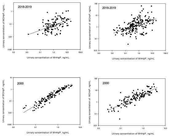 As expected, the correlation analysis showed statistically significant correlations (p < 0.001) between the log10-transformed concentrations of MHHpP and MOHpP (Figure 3). The correlation was more significant in samples collected in 2000 (correlation coefficient (r), (95% CI) = 0.94 (0.91, 0.95)) than in samples collected in 2018–2019 (r, (95% CI) = 0.59 (0.49, 0.67)) (Figure 3). To explain this finding, we hypothesize that phthalate formulations used before the 2010 ending of DiHpP production in the USA may have included a larger percentage of DiHpP isomers with straight-chain C-backbone, where oxidation to form MOHpP can readily occur. Urinary concentrations of MHHpP also correlated with those of MCHxP (r, (95% CI) = 0.87 (0.83, 0.91), 0.49 (0.38, 0.59) for 2000 and 2018–2019, respectively (p < 0.001)) (Figure 3), suggesting DiHpP as the primary source for MCHxP in these samples.