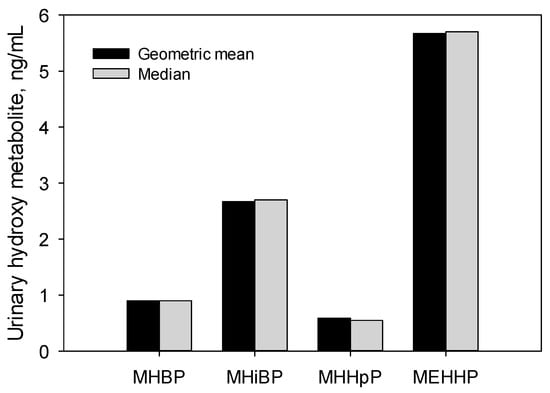 We also compared the urinary MHHpP concentrations to the hydroxylated metabolites of dibutyl phthalate, diisobutyl phthalate, and di-2-ethylhexyl phthalate concentrations in human urine reported in the 2015–2016 National Health and Nutrition Examination Survey [].