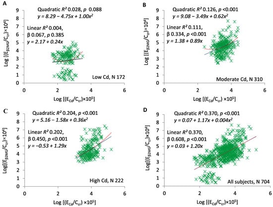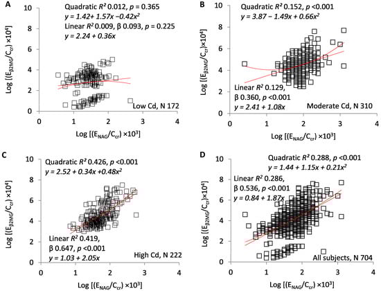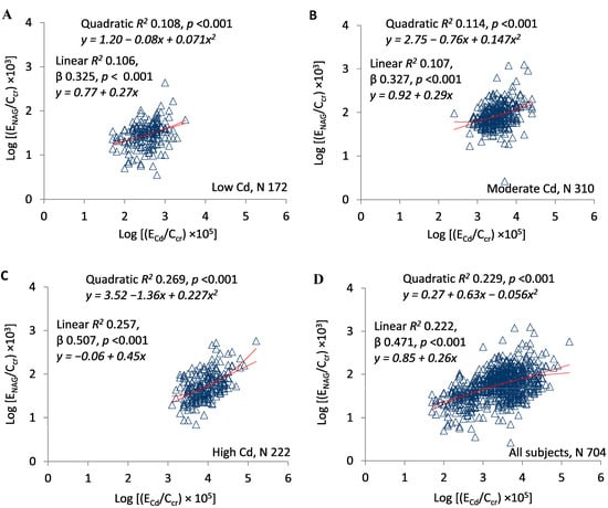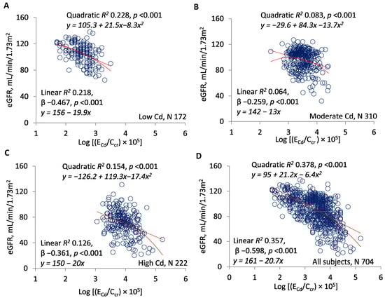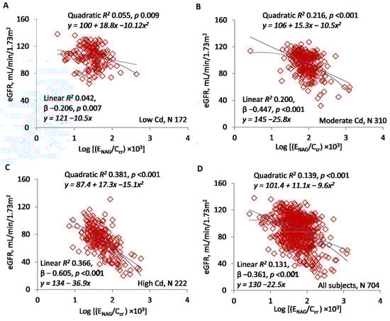 | Excretion Rates of Cd or NAG | Number of Subjects | eGFR vs. log[(ECd/Ccr) × 105] or log[(ENAG/Ccr) × 103] | |||