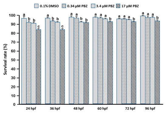 Comparison of PBZ effects on survival rate after exposure of zebrafish embryos beginning at different stages. Survival rates at 5 dpf were calculated for embryos exposed to 0.1% DMSO (control), and 0.34, 3.4, and 17 μM PBZ. Exposures began at 24, 36, 48, 60, 72 or 96 hpf. Data represent the mean (±standard deviation, SD) of three independent experiments; 80 embryos were assessed in each treatment (N = 3. n = 240 embryos). Bars not sharing a common letter are significantly different. Data were compared by ANOVA followed by Fisher’s least significance difference test (p < 0.05).