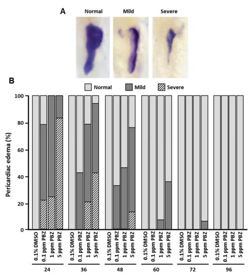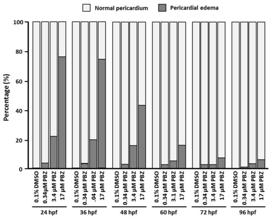 Pericardial edema is induced by PBZ in zebrafish embryos exposed at early stages. Zebrafish embryos were exposed to a range of PBZ concentrations (0.34, 3.4, and 17 μM) beginning at different stages (24, 36, 48, 60, 72, and 96 hpf). The pericardiac phenotype was observed at 5 dpf, and ratios of affected individuals were calculated. Data represent the mean of three independent experiments; 30 embryos were assessed in each treatment (N = 3. n = 90 embryos).