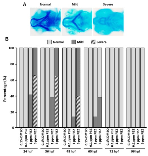 Although PBZ toxicity has been studied for several years, the molecular basis of its effects are still not clear. In this study, we exposed zebrafish embryos to PBZ at different stages and concentrations; we then examined the effects of PBZ exposure on survival rate, percardium, head skeleton, and digestive organ development in zebrafish at 120 hpf. We found that embryos exhibit dose-dependent toxicity phenotypes, consistent with the results from our previous studies. Furthermore, more severe embryonic developmental toxicity was observed when embryos were exposed to PBZ at earlier stages. Surprisingly, zebrafish embryos exhibited defective head skeleton formation after 3.4 and 17 μM PBZ treatment when the initial exposure time was 48 and 60 hpf (hours post fertilization); this timing suggests that PBZ not only reduces neural crest cells, but it also impairs the cartilage differentiation process. While all digestive organs (pancreas, intestine and liver) are derived from embryonic endoderm, embryos exposed to PBZ at different stages exhibited different severities of effects in each tissue. Overall, our study reveals the developmental toxicity of PBZ at different concentrations and initial exposure stages, providing a powerful reference for future mechanistic studies on the toxic effects of PBZ in developing heart, head skeleton and digestive organs.