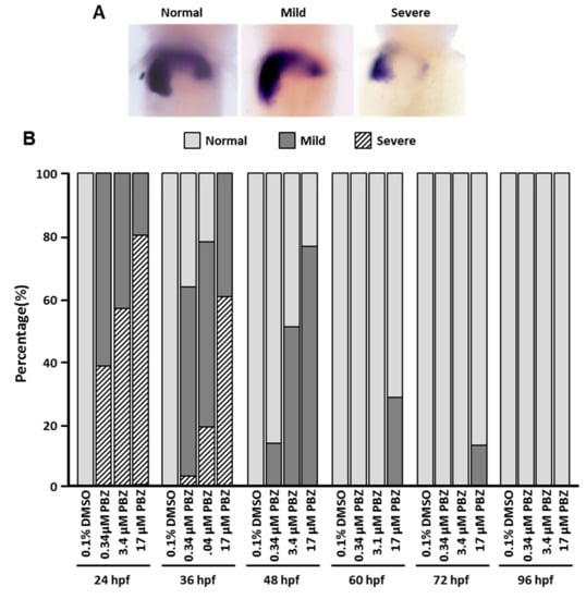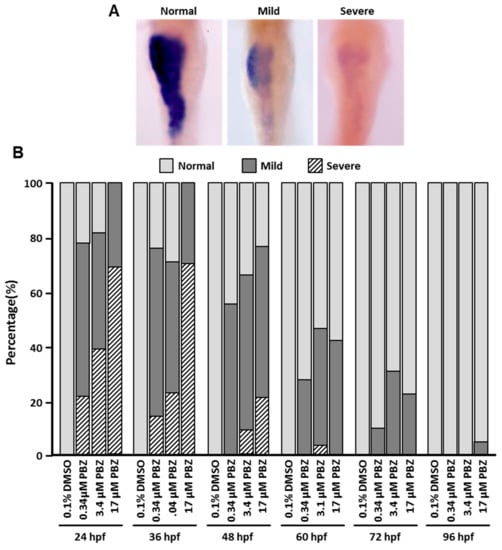 The AB zebrafish strain (Danio rerio) was used. Zebrafish were maintained under standard laboratory conditions at 28.5 °C under a day-night cycle (14 h light/10 h dark) with an automatic timer. Zebrafish embryos were spawned by natural mating, and at the 1- to 8-cell stage, embryos were collected and evaluated for quality. Qualified embryos were cultured in sea salt egg water (0.0375% sea salt in deionized distilled water) containing various concentrations of PBZ [0.34 μM, 3.4 μM, 17 μM] or DMSO (0.1%, v/v) beginning at 24, 36, 48, 60, 72, or 96 hpf, and incubated at 28.5 °C. The survival ratios and organ development defects were determined at 5 dpf (days post fertilization). Culture media was not renewed during experiments. For some experiments, 1-phenyl-2-thiourea (final concentration of 0.2 mM; Sigma–Aldrich) (Sigma–Aldrich, Louis, MO, USA) was supplied to the media at 20–22 hpf to inhibit pigmentation, as described previously []. Embryos were fixed at 5 dpf in 4% paraformaldehyde (PFA) (PBT; 1× PBS/0.1% Tween-20) at 4 °C overnight, followed by dehydration and storage in 100% methanol at −20°C prior to use in experiments.