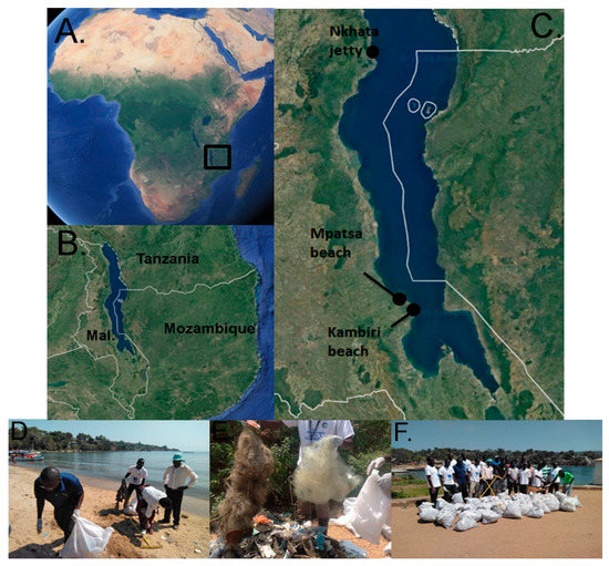 Location of the three beach clean-up sites on the Malawian coast of Lake Malawi (A–C, Mal. = Malawi). Images D–F show the volunteers during the clean-up and typical examples of the debris collected during the clean-up at Nkhata jetty in 2018.