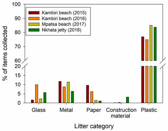 A total of 490,064 items of anthropogenic litter were collected by over 2000 volunteers at the three locations over the four-year period. With reference to the number of items collected, Nkhata jetty (>200,000 items) was the most impacted site, followed by Kambiri beach (2016 (> 175,000 items) and 2015 (approximately 90,000 items) and the Mpatsa beach (approximately 20,000 items) (Table 2). Typically, the numbers of items collected at different locations are normalized to the area of the site in order to make more valid comparisons of litter densities. The order of sites with regard to litter density is: Nkhata jetty (5.11 items/m2) > Kambiri beach (2016, 1.11 items/m2) > Mpatsa beach (0.96 items/m2) > Kambiri beach (2015, 0.89 items/m2). These densities are marginally lower than those reported elsewhere, 2 to 10 items/m2 along the coast of Chile [3] and 2.3 to 6.3 items/m2 reported along Brazilian coast [4], but typical densities reported globally range from 0–2–5 items/m2 [3]. An average density of 45,000 items/m2 was recorded from Japanese beaches [29], though it should be noted that the authors counted fragmented Styrofoam as individual items which are not usually counted individually in other studies.