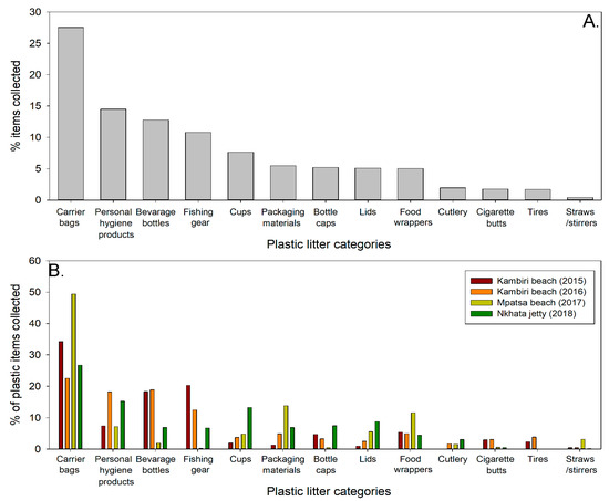 Breakdown of different categories of plastic debris as percentage of plastic items found at all sites and years combined (A) and by each site and year (B).