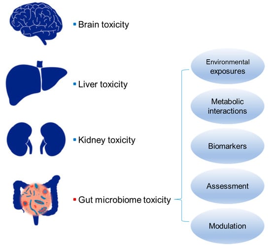 Certain environmental toxins can induce damage and dysfunction in the liver, which is termed as liver toxicity. Exposure to these toxins changes the morphology and functionality of the liver, hence leading to liver diseases. Similarly, exposure to some environmental chemicals causes structural differences and functional alterations in the gut microbiome, which probably results in a series of adverse health outcomes. For instance, arsenic exposure can perturb the composition and metabolites of the mouse gut microbiome, which potentially contributes to its toxicity []. Given the increasingly recognized role of the gut microbiome in human health coupled with its susceptibility to environmental insults, it is of significance to define gut microbiome toxicity. As the gut microbiome is viewed as a new human organ by its importance, we accordingly define the environmentally driven functional damage in the gut microbiome as gut microbiome toxicity. The development of gut microbiota-related diseases can be generalized as environmental factors leading to deleterious alterations in the gut microbiome, which adversely affect human health via host–gut microbiota interactions. In other words, gut microbiome toxicity triggered by environmental exposures contributes to gut microbiota-related adverse outcomes. By including gut microbiome toxicity into the organ toxicity family, we can now discuss the relationship between the environment and gut microbiota-related diseases in the context of toxicology (Figure 1).