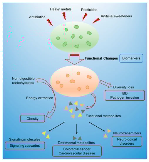 To summarize, exposure to xenobiotics such as antibiotics, heavy metals, and artificial sweeteners induces gut microbiome toxicity. Compositional alterations and functional changes occur along with this process in the gut microbiome, which can serve as potential biomarkers of gut microbiome toxicity. These chemical-induced perturbations lead to human diseases via several mechanisms including changes in the metabolite profiles, diversity loss, and altered energy metabolism (Figure 2).