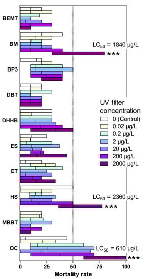 Mortality rate of A. salina exposed to the 10 UV filters at 6 concentrations. Boxes delineate the minimal and maximal values and the vertical line is the median of six replicates. Significance levels relative to control determined by ANOVA followed by the Tukey’s multiple comparison test: *** p < 0.001. Results were not significant unless otherwise stated. For BM, HS and OC, the LC50 is reported on the figure.