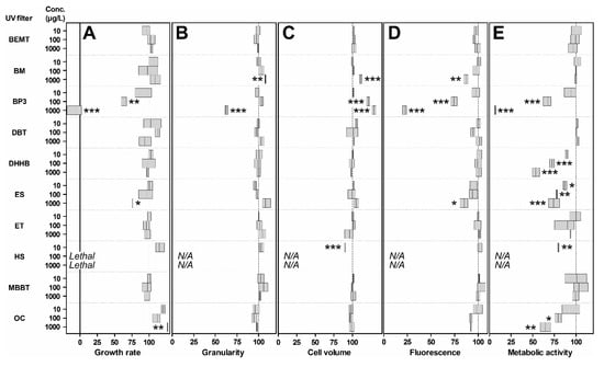 - Kaiser, D.; Sieratowicz, A.; Zielke, H.; Oetken, M.; Hollert, H.; Oehlmann, J. Ecotoxicological effect characterisation of widely used organic UV filters. Environ. Pollut. 2012, 163, 84–90. [Google Scholar] [CrossRef]