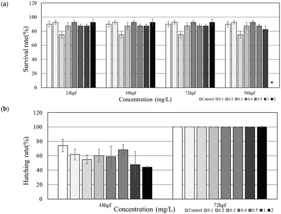 Survival (a) and hatching rate (b) of zebrafish embryos/larvae under polyhexamethylene guanidine-phosphate (PHMG-P) exposure (N = 10). Asterisks (*) denotes statistical significance (p < 0.05).