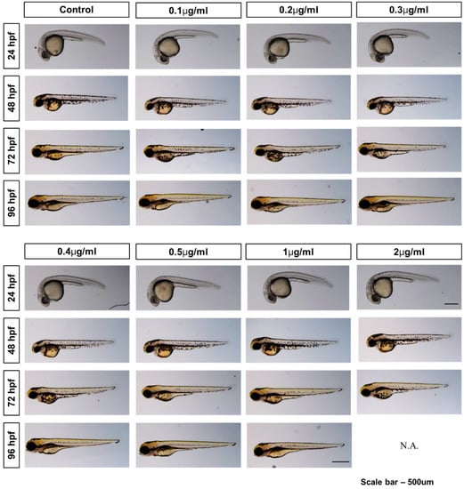 At 24 hpf, group photos were taken at 20× magnification in E3 medium. Larvae were captured at 32× magnification after 24 hpf. The larvae were anesthetized using tricaine methane sulfonate (0.004% w/v) and transferred to a glass slide containing methylcellulose to enable correct alignment. Coagulation of embryos, somite formation, non-detachment of tail, and absence of active heartbeat were all observed to assess the survival and developmental progress. Morphological parameters including bent spines, head malformation, and pericardial edema were also checked.
