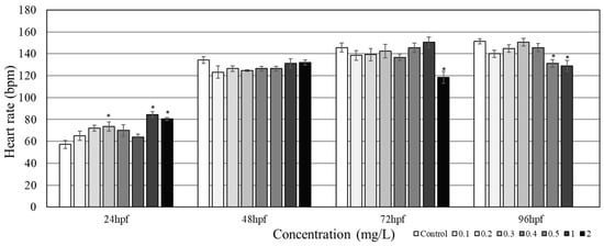 Heart rate of zebrafish embryos/larvae at 24 hpf, 48 hpf, 72 hpf, and 96 hpf under PHMG-P exposure (N = 5). Asterisk (*) denotes statistical significance (p < 0.05).