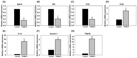 Gene transcription changes of Itgb1b (A), TNC (B), Arg1 (C), Arg2 (D), IL-1β (E), Serpine-1 (F), and Ptgs2b (G) after 96 hpf PHMG-P exposure (N = 3). Asterisks (* and **) denotes statistical significance with p < 0.05 and p < 0.01, respectively.