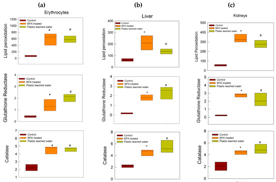 There was a significant increase in lipid peroxidation, glutathione reductase activity, and catalase activity in the erythrocytes, liver, and kidneys of rats of both BPA-treated and plastic leached water-treated groups as compared to the control group (Figure 5a–c).