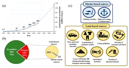 (a) Global plastic production since the 1950s together with an estimate of the global plastic production until 2050. (b) Estimated percentage of primary microplastics (MPs) that ends up into oceans respect the total MPs materials released into marine ecosystems every year. The percentage of land-based and marine-based contributions are also presented. (c) Most important land-based and marine-based sources of primary MPs released into marine ecosystems.
