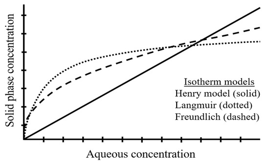 Another major characteristic to take into account is the glass transition temperature (Tg), which is only related to the amorphous domains of the polymer. At temperatures below Tg, the amorphous segments are in the glassy state, and above Tg, they are in the rubbery state. It is crucial to mention that rubbery polymers (e.g., PE and PP) have higher diffusivity due to their larger free volume and their greater flexibility and mobility. Hence, these properties enhance the absorption of organic pollutants in these regions. The sorption isotherms of this type of polymers are essentially linear (i.e., Henry isotherm model, Figure 3), and the absorption process is reversible and non-competitive [78].