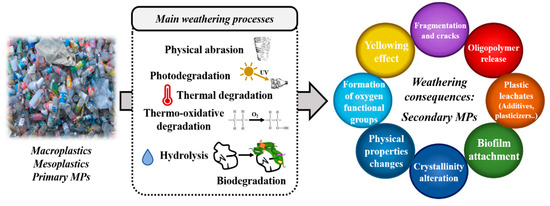 Pristine or virgin plastics are the newly manufactured and have not suffered any degradation by the environment. Conversely, aged or weathered plastics are those that have been exposed to degradation processes (i.e., thermal, mechanical, biological, radiative, oxidative breakdown or hydrolysis) [14,73]. The susceptibility to these environmental conditions enables the fragmentation and cracking of plastic debris into smaller particles. Therefore, an in-depth study of the degradation mechanisms of plastics caused by weathering, which facilitates the fragmentation of plastics into smaller-sized particles, is required.