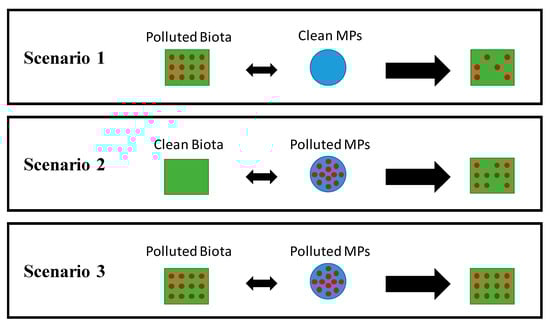As introduced above, MPs possess the ability to sorb organic chemicals due to their hydrophobic surface. Thereupon, pollutants may desorb from the plastics leading to an increment of their bioavailability to aquatic organisms. This capacity has led to the hypothesis that, in addition to direct effects on their interactions with biota (e.g., entanglement, ingestion), MPs might also play a significant role in aquatic ecotoxicology as vectors for toxic compounds. This hypothesis is still on the debate within the scientific literature. There are three possible scenarios which will be described below and graphically summarized in Figure 5. These different options should be analysed in-depth to accurately assess the real potential of MPs as carriers of hazardous chemicals and characterize the possible effects on the bioaccumulation and bioavailability of these compounds through MPs ingestion.