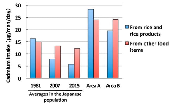 16]. Cd intake has been gradually decreasing in Japan: 31.1 µg/day (16.2 µg/day from rice and 14.9 µg/day from other food items) in 1981, 21.1 µg/day (7.8 µg/day from rice and 13.3 µg/day from other food items) in 2007, and 17.8 µg/day (5.7 µg/day from rice and 12.1 µg/day from other food items) in 2015. This was mainly attributed to a reduction in Cd intake from rice. Cd intake levels from rice and rice products in areas A (28.3 µg/day) and B (19.4 µg/day) were 3.6- and 2.5-fold higher, respectively, than that (7.8 µg/day) by the general population in 2007, while Cd intake levels from other food items in areas A and B (approximately 24.0 µg/day) were 1.8-fold higher than that (13.3 µg/day) by the general population. Total Cd intake levels in areas A and B were approximately 2.5-fold higher than that by the general population.