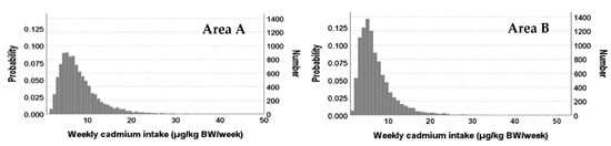 Table 13). The distributions of weekly Cd intake levels in areas A and B were shown in histograms (