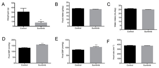 (A) Weight gain, (B) food intake, (C) water intake, (D) systolic blood pressure, (E) diastolic blood pressure, and (F) heart rate in control and sunitinib (Su)-treated (25 mg/kg/day) animals. Values are expressed as mean ± S.E.M. of 15 animals per group. ** p < 0.01, *** p < 0.001 vs. control group.