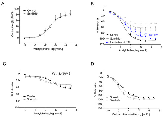 Dose-response curve of (A) vasoconstriction mediated by phenylephrine (Phe) (10−9–3 × 10−5 mol/L); (B) ACh-mediated (10−9–3 × 10−5 mol/L) vasodilation, including preincubation with ML171 (10−4 mol/L); (C) ACh-mediated vasodilation in the presence of L-NAME (Nω- nitro-L-arginine methyl ester (10−4 mol/L); and (D) vasorelaxation response to sodium nitroprusside (SNP) (10−10–3 × 10−6 mol/L) in phenylephrine (Phe)-precontracted vessels from control and sunitinib-treated (25 mg/kg/day) animals. The results correspond to mean ± S.E.M. of at least six experiments (n = 6–12). Results are expressed as relative percentages of the maximum contraction induced by 60 mmol/L KCl (A), or to the contraction induced by a submaximal dose of Phe (B–D). ** p < 0.01; *** p < 0.001 vs. control group, # p < 0.05, ## p < 0.01, ### p < 0.001 vs. Su group.