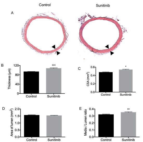 Aorta thickness (A and B; delimited by arrowheads), cross-sectional area (CSA) of tunica media (C), lumen area (D) and media/lumen ratio (E) in control and Su-treated (25 mg/kg/day) animals. Magnification: 10×. Values are expressed as mean ± S.E.M. of six animals per group. * p < 0.05; ** p < 0.01; *** p < 0.001 vs. control group.
