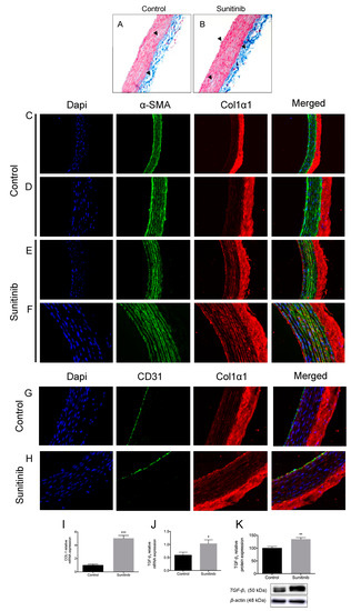 Masson’s trichrome staining for collagen fibers in blue (A,B, marked with arrowheads), double immunostaining of collagen 1 alpha 1 (Col1α1) (red) and α-smooth muscle actin (α-SMA) from vascular smooth muscle cells (VSMCs) (green) (C–F), and Col1𝛼1 (red) and CD31 (green) (G,H), and protein/mRNA expression of Col1 (I) and TGF-β1 (J,K), in aortas from control and sunitinib-treated (25 mg/kg/day) animals. Magnification 10× for Masson’s trichrome staining. Magnifications: 10× (A,B), 20× (C,E) and 40× (D,F–H). Values are expressed as mean ± S.E.M. of at least 6 animals per group (n = 6–8). * p < 0.05; ** p < 0.01; *** p < 0.001 vs. control group.