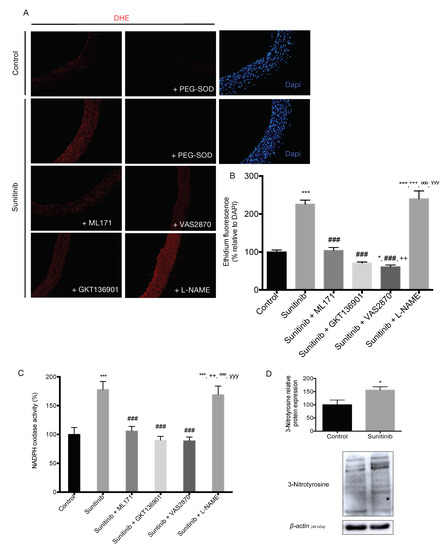 Superoxide anion production in thoracic aortas. (A) Representative dihydroethidium (DHE) staining, (B) superoxide anion quantification, (C) NADPH oxidase activity in aorta homogenates, and (D) 3-nitrotyrosine protein expression, in aortas from control and sunitinib-treated (25 mg/kg/day) animals. Magnification: 10×. Values are expressed as mean ± S.E.M. of at least four animals per group (n = 4–8). * p < 0.05, *** p < 0.001 vs. control group; ## p < 0.01, ### p < 0.001 vs. Su group; ++ p < 0.01, +++ p < 0.001 vs. Su + ML171 group; ººº p < 0.001 vs. Su + GKT136901 group; yyy p < 0.001 vs. Su + VAS2870 group.