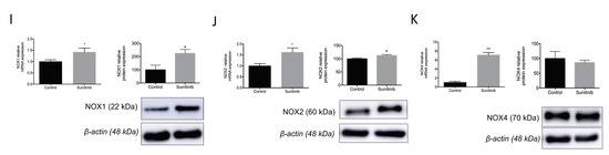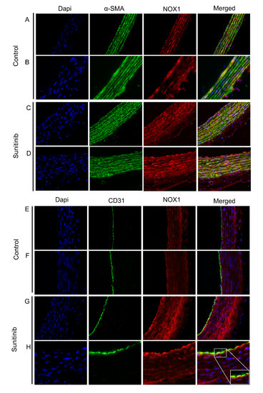 Double immunostaining of NOX1 (red) and α-SMA (VSMCs) (green) (A–D), and NOX1 (red) and CD31 (green) (E–H), in aortas from control and sunitinib-treated (25 mg/kg/day) animals. Magnifications: 40× (A,C,E,G) and 100× (B,D,F,H). (I–K) Protein and mRNA expression of NOX1 (I), NOX2 (J), and NOX4 (K). Values are expressed as mean ± S.E.M. of eight animals per group. * p < 0.05; *** p < 0.001 vs. control group.