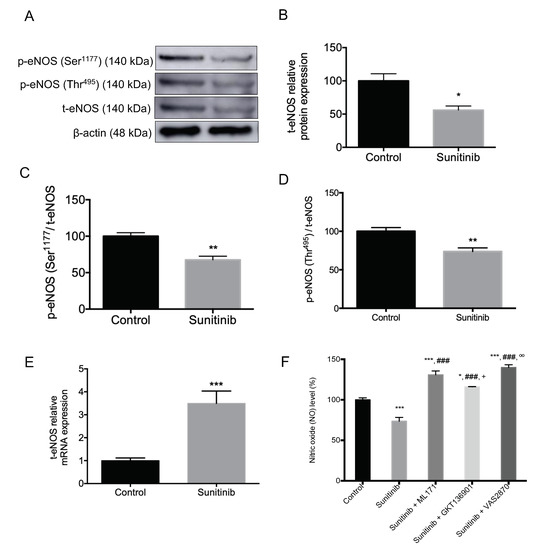 Protein expression of (A) p-endothelial nitric oxide synthase (eNOS) (Ser1177) and p-eNOS (Thr495); (A,B) total eNOS (t-eNOS); (C) ratio p-eNOS (Ser1177)/total eNOS; (D) ratio p-eNOS (Thr495)/total eNOS; (E) t-eNOS mRNA expression; and (F) NO levels in absence or presence of NOX inhibitors, in aortas from control and sunitinib-treated (25 mg/kg/day) animals. Values are expressed as mean ± S.E.M. of eight animals per group. * p < 0.05; ** p < 0.01; *** p < 0.001 vs. control group.; ### p < 0.001 vs. Su group; + p < 0.05 vs. Su + ML171 group; ºº p < 0.01 vs. Su + GKT136901 group.
